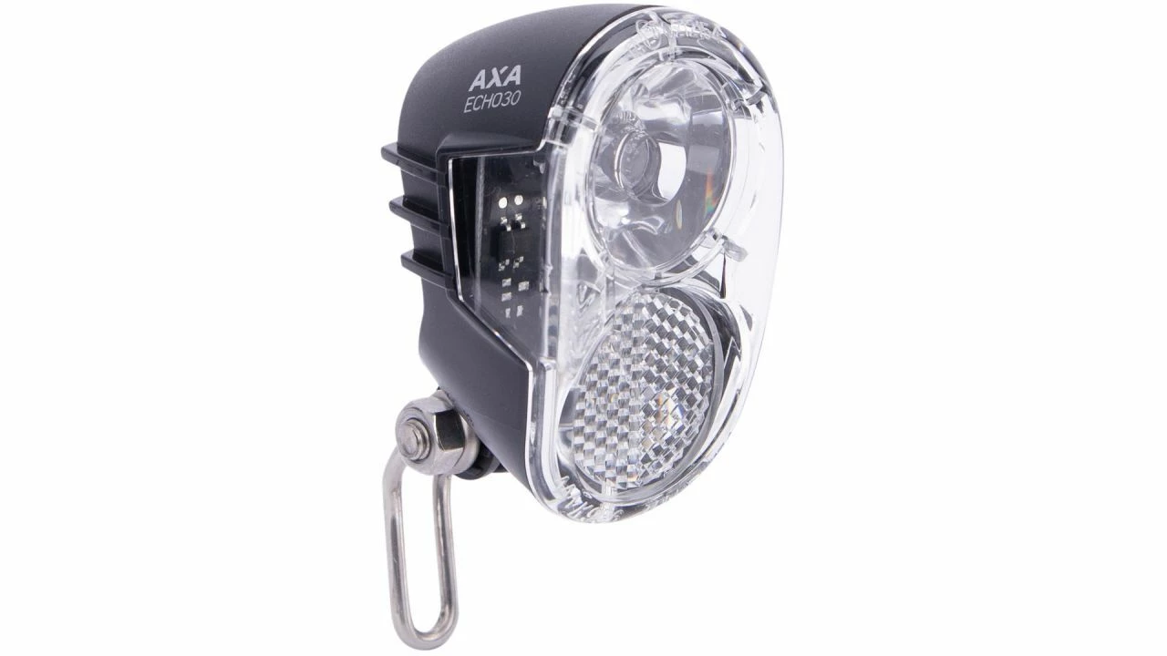 Echo 30 von AXA ist ein universell einsetzbares Dynamo-Vorderlicht mit einer hohen Beleuchtungsstärke von 30 Lux. Der Scheinwerfer bietet einen integrierten Retroreflektor und eine optimale Lichtverteilung. <br><br>Beide Funktionen steigern Ihre Sicherheit, da Sie mit ihnen für den entgegenkommenden Verkehr besser sichtbar sind und selbst eine gute Sicht auf den vor Ihnen liegenden Weg haben. <br>Übrigens sehen Sie mit dem Lichtbündel 50 m weit und sind auf eine Entfernung von bis zu 3 km zu sehen. <br>Zusätzliche Vorteile ergeben sich durch die optional erhältliche Standlicht-Funktion (Steady) und die ebenfalls auf Wunsch erhältliche Einschalt-Automatik (Auto). Wo der Scheinwerfer dank des Standlichts im Stehen noch einige Minuten lang weiter leuchtet, schaltet es sich mit der Einschalt-Automatik bei einsetzender Dämmerung von selbst ein.<br><br>Ferner ist der robuste Edelstahlbügel dieses Scheinwerfers für jeden Straßentyp geeignet. Sie haben auch die Möglichkeit, ihn durch einen Bügel zur teilweisen Integration an den gängigen Vordergabeln zu ersetzen.
