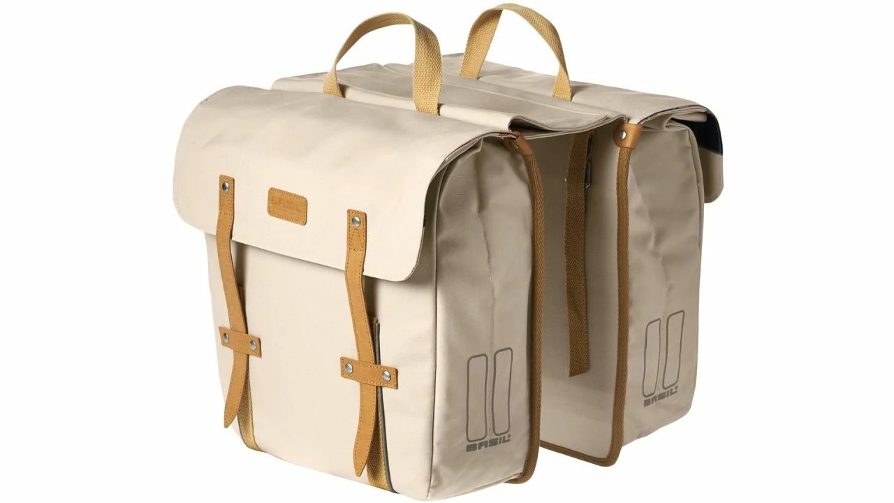 Die BASIL Portland Slimfit Double Bag: Das sind 2 Fahrradtaschen, die zusammen eine doppelte Fahrradtasche formen. Durch die Haken und Handgriffe sind die Taschen leicht an diversen Gepäckträgern zu befestigen und separat mitzunehmen. Damit macht die Tasche Fahrten zum Supermarkt oder zur Verabredung zum Mittagessen einfacher und schöner. <br><br>Die Haken werden auf sorgfältige Art und Weise mit Hilfe einer magnetischen Klappe verdeckt. Wenn die Tasche als doppelte Tasche benutzt wird, liegt die Klappe über dem Gepäckträger. Die Tasche ist ausgerüstet mit Reflektor-Details, wodurch man bei Dunkelheit besser zu sehen ist. Jede Tasche ist mit einer Regenhülle und einem wasserabweisenden Faltverschluss ausgestattet, womit man auch für einen Regenschauer gerüstet ist. <br><br>Gefaltet bietet diese doppelte Fahrradtasche einen Inhalt von 24 l, welcher sich auf 29 l zu vergrößern lässt, wenn sie ungefaltet ist. So hat man genug Platz für seine Einkäfe oder die Ausrüstung für einen Ausflug. Das hochwertige Material, die hippe Innenfütterung mit Karomuster und die beigefarben Details aus synthetischem Papier sorgen für eine Vintage-Ausstrahlung. Die Tasche ist mit Hilfe von Bändern und einem Klettverschluss verschließbar.