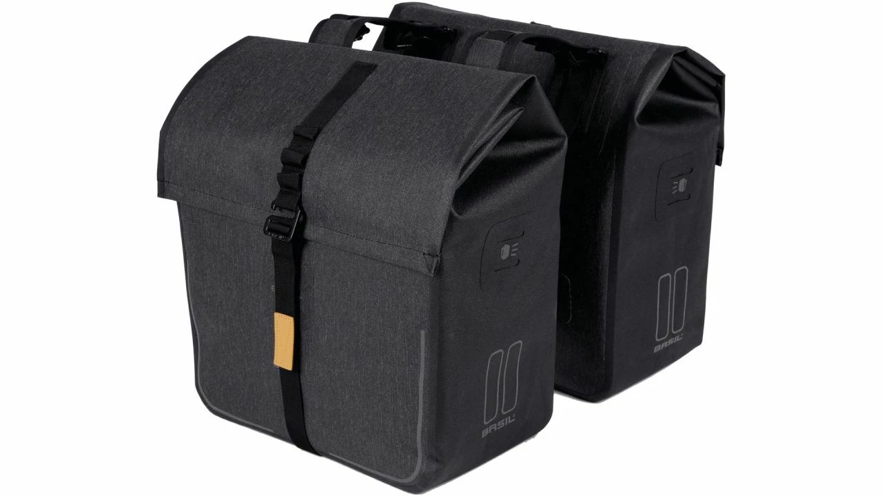 In der Doppelpacktasche Urban Dry von BASIL vereinen sich mehrere praktische Eigenschaften. So ist die Tasche wasserdicht und hat einen Gesamtinhalt von 50 Litern. Es genug Platz für Einkäufe, auch einer ausgedehnten Shoppingtour steht mit dieser Tasche nichts im Weg. <br><br>Das BASIL Universal Bridge System sorgt dafür, dass die Tasche auf diverse Gepäckträger (auch von E-Bikes) passt. Ebenfalls lässt sie sich mit Racktime-, i-Rack- und Carrymore-Platten kombinieren.Das ist noch nicht alles: Die doppelte Fahrradtasche verfügt über einen verstellbaren Faltverschluss. Zudem ist man durch die Reflektorseiten bei Dunkelheit besser sichtbar. <br><br>Auch an die Beleuchtung wurde gedacht. So sorgt die Möglichkeit, LED-Beleuchtung zu befestigen, für bessere Sichtbarkeit und damit Sicherheit. Die geschweißten Nähte der Tasche und ihr Tarpaulin machen die Urban Dry wasserdicht. Somit ist ein Regenschauer keine Ausrede mehr, nicht ins Fitnessstudio zu gehen.