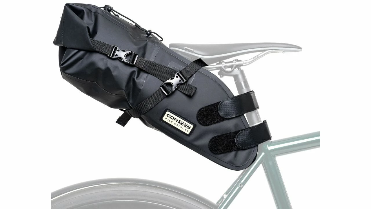 Die Mile Grinder Back 10 Satteltasche von CONTEC ist dein auf volle Stabilität ausgelegter Begleiter, wenn du mal wieder zu einem Bikepacking-Abenteuer aufbrichst. Die sehr großvolumige Tasche bietet 10 Liter Stauraum, um dein Reisegepäck wie Wechselkleidung oder Werkzeug problemlos mitzunehmen. Der flexible Rollverschluss sowie einige Kompressionsriemen lassen sich so einstellen und festzurren, dass dein Gepäck möglichst wenig hin und her rutscht, vor allem, wenn es auch mal durch grobes Terrain oder über unebene Waldwege geht.<br><br>Die Mile Grinder Back 10 kannst du mit Riemen ganz einfach an der Sattelstütze deines Bikes befestigen. An den Kontaktstellen zwischen Stütze und Riemen befinden sich rutschfeste Befestigungen, damit in erster Linie die Sattelstütze ohne Kratzer davonkommt und die Tasche im Gelände nicht verrutscht.<br><br>Gerätst du mal in einen Schauer ist das für die Satteltasche kein Thema, denn sie ist aus wasserdichtem Polyester und PVC gefertigt. Deine Regenjacke hast du für solche Fälle auch immer schnell griffbereit, denn die kann am Schlaufenzug an der Taschenoberseite fixiert und bei Bedarf schnell herausgezogen werden. Auch ein Rücklicht kannst du dort noch zusätzlich befestigen – optimal für trübe Sichtverhältnisse.